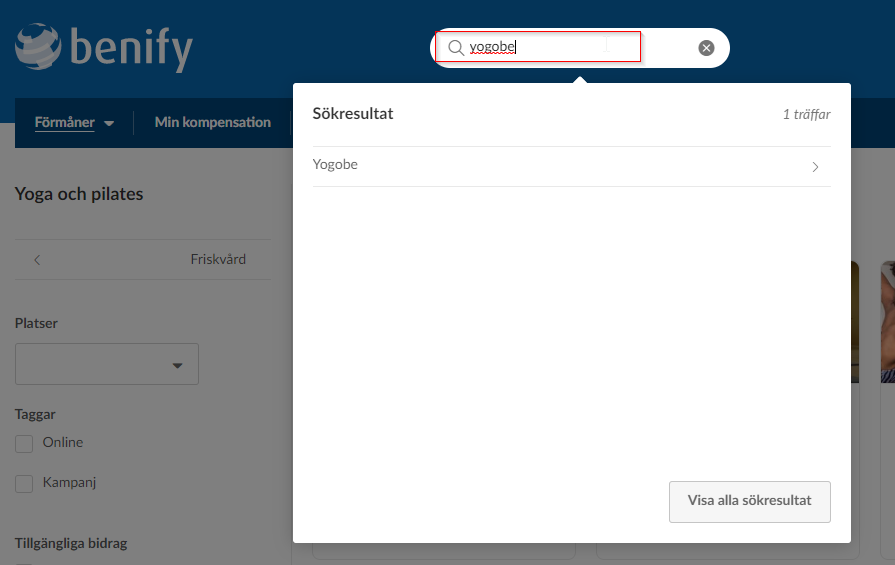 * Så här ser det ut när du söker på Yogobe i Benifys portal: